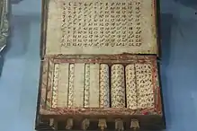 Napier's bones is a manually-operated calculating device created by John Napier of Merchiston, Scotland for the calculation of products and quotients of numbers. The method was based on lattice multiplication, and also called rabdology, a word invented by Napier. Napier published his version in 1617.[1] It was printed in Edinburgh and dedicated to his patron Alexander Seton.