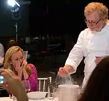 While working as chief technology officer at Microsoft, Myhrvold took leave to earn his culinary diploma from École de Cuisine La Varenne in France.[16] Myhrvold's early culinary training was as an observer and unpaid apprentice at Rover's, one of Seattle's leading restaurants, with Chef Thierry Rautureau.[45] Myhrvold is the principal author of a culinary text entitled Modernist Cuisine: The Art and Science of Cooking,[46] released in March 2011, on the application of scientific research principles and new techniques and technology to cooking.[47] That book, which earned a James Beard Foundation Award for "cookbook of the year" in 2012, was followed by the books Modernist Cuisine at Home,[48] The Photography of Modernist Cuisine,[49] Modernist Bread,[50] and Modernist Pizza,[51] all self-published by Myhrvold and with him as lead author. Myhrvold was part of a team that won first place at the world barbecue championships in Memphis.[16] He has appeared as a guest judge on Top Chef.