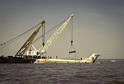While established on the approach the first officer neglected to make altitude and approach fix call outs. The ground proximity alarm sounded and the first officer checked his altimeter. He read it as 1,500 feet (460 m) and turned off the alarm. The flight data recorder would later show their actual altitude at this point was only 500 feet (150 m). The flight crew may have been distracted by the alarm and failed to realize they passed through the minimum descent altitude. Shortly after this they impacted Escambia Bay.[2] Barge traffic in the area assisted in the evacuation. Three passengers drowned attempting to exit the aircraft. The aircraft was intact after the accident and was removed to a hangar at Naval Air Station Pensacola but written off due to extensive sea water corrosion. The airframe was subsequently disassembled and removed from the air base to a scrapping location.