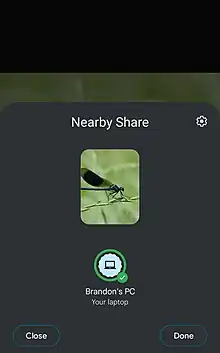 Nearby Share was a functionality developed by Google that allows data to be transferred between devices via Bluetooth, Wi-FI Direct or Internet. In 2024, it was merged into Samsung's Quick Share. It was available for Android, ChromeOS and Microsoft's Windows.[1] It was first released on August 4, 2020.
