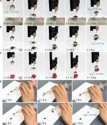 To estimate the gripping forces of smaller and larger spiders, researchers created a plot to predict the gripping force relative to the size of the spider. The wolf spider's body weight is relatively equal to the gripping force of its legs.[1] The mass of the gripper is 33.5 mg and can lift 1.3 times its body weight (43.6 mg or 0.35 mN).[1] However, with larger spiders, the gripping force relative to body weight decreases. For example, a 200-gram goliath birdeater is predicted to lift 10% of its weight (20 grams or 196 mN).[1][6] Though there is an inverse relationship between spider mass and gripping force, larger spiders exert greater gripping forces than smaller spiders.
