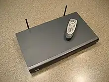 The MP115 was a technology trial, and only 600 were made. It used the same small form-factor as the MP101 but without the display. This unit was probably what could be considered the beginnings of the Digital Entertainer line as it supported XviD and MPEG1 and MPEG2 playback and had composite, S-Video and SCART output for connection to a TV, along with line stereo RCA. Audio was still supported along the same lines as the MP101. Again, no external buttons and all control from the remote. Dual-antenna 802.11g wireless was on board with wired Ethernet port.