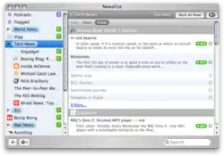 NewsFire is an RSS newsreader developed by David Watanabe for Mac OS X. It supports Atom, RSS, and Podcasting. NewsFire features groups, labels, smart groups, search, and integration with iTunes, Spotlight, and weblog editors. NewsFire can also import and export a blogroll from and to OPML; however, it cannot import Google Reader OPML at this time due to a known bug.