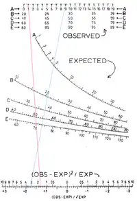 The scale along the top is shared among five different ranges of observed values: A, B, C, D and E. The observed value is found in one of these ranges, and the tick mark used on that scale is found immediately above it. Then the curved scale used for the expected value is selected based on the range. For example, an observed value of 9 would use the tick mark above the 9 in range A, and curved scale A would be used for the expected value. An observed value of 81 would use the tick mark above 81 in range E, and curved scale E would be used for the expected value. This allows five different nomograms to be incorporated into a single diagram.