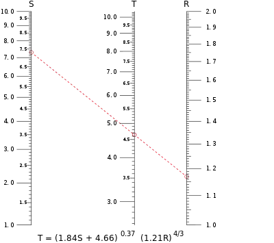 The sample isopleth shown in red on the nomogram at the top of this article calculates the value of T when S = 7.30 and R = 1.17. The isopleth crosses the scale for T at just under 4.65; a larger figure printed in high resolution on paper would yield T = 4.64 to three-digit precision. Note that any variable can be calculated from values of the other two, a feature of nomograms that is particularly useful for equations in which a variable cannot be algebraically isolated from the other variables.