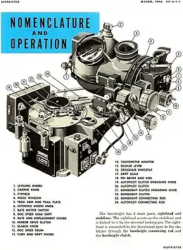 Norden's version of the system was very similar to the Army's Estoppey D-4 of the same era, differing largely in the physical details of the actual sights. The D-4 used thin wires as the sights, while Norden's would use the small telescope of the Mark III-A. To use the system, the bombardier looked up the expected time it would take for the bombs to fall from the current altitude. This time was set into a countdown stopwatch, and the sights were set to the angle that the bombs would fall if there was no wind. The bombardier waited for the target to line up with a crosshair in the telescope. When it did, the timer was started, and the bombardier rotated the telescope around its vertical axis to track the target as they flew toward it. This movement was linked to a second crosshair through a gearing system. The bombardier continued moving the telescope until the timer ran out. The second crosshair was now at the correct aiming angle, or range angle, after accounting for any difference between groundspeed and airspeed. The bombardier then waited for the target to pass through the second crosshair to time the drop.[6]