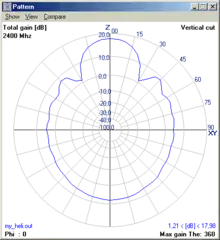 The output indicates that the antenna has a maximum gain of 9.75 dBi, a little over three times the gain of an isotropic antenna. However, as the signal moves even five degrees to the side, this has dropped to 9.5. When you reach 75 degrees off the front, the antenna begins to have negative gain. This indicates that this antenna is fairly directional, and one would expect it to have a high front-to-back ratio.[18]