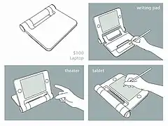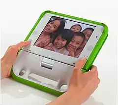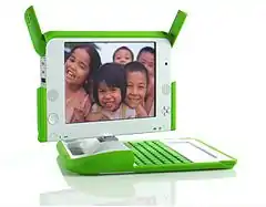 The OLPC XO (formerly known as $100 Laptop,[2] Children's Machine,[3] 2B1[4]) is a low cost laptop computer intended to be distributed to children in developing countries around the world,[5] to provide them with access to knowledge, and opportunities to "explore, experiment and express themselves" (constructionist learning).[6] The XO was developed by Nicholas Negroponte, a co-founder of MIT's Media Lab, and designed by Yves Behar's Fuseproject company.[7] The laptop is manufactured by Quanta Computer and developed by One Laptop per Child (OLPC), a non-profit 501(c)(3) organization.