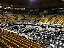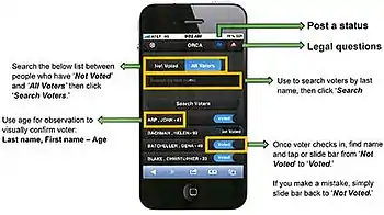 The system was designed to show the names and addresses of every eligible voter in a particular precinct. When the voter had gone through the polling station, a logged-in volunteer would simply slide a bar on their phone screen to note that fact. If there were any problems in the polling station, such as erroneous voting lists, illegal activities or issues with the voting machines, they could press an on-screen yellow button to send an alert to the campaign's lawyers. A Twitter-style instant messenger system would also enable volunteers and the campaign to share information in real time. Those without smartphones were also catered for; the Romney campaign would provide a list of voters to enable volunteers to check off individual names and phone the information into the campaign's headquarters.[1] The data they gathered would be monitored by 800 volunteers at campaign headquarters on the floor of TD Garden in Boston via a Web-based application; it would be used to coordinate contacts throughout election day to pro-Romney voters who had not shown up at the polls. As a fallback, a voice response system would also be established, to allow mobile phone users to call in information if the online system was not working.[3] The voice response system was brought in the night before the election, setup on the floor of TD Garden, and went live on election day.
