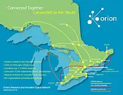 The network spans 6,000 kilometres (3,700 mi) and connects 28 communities throughout Ontario. Almost 100 organizations and special projects connect to ORION directly, including 21 universities, 22 colleges, 34 school boards representing 2 million students, 13 teaching hospitals and medical research centres, and other research and educational and public library facilities.[1]