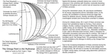 The Omega Point is a theorized future event in which the entirety of the universe spirals toward a final point of unification. The term was invented by the French Jesuit Catholic priest Pierre Teilhard de Chardin (1881–1955).[1] Teilhard argued that the Omega Point resembles the Christian Logos, namely Christ, who draws all things into himself, who in the words of the Nicene Creed, is "God from God", "Light from Light", "True God from True God", and "through him all things were made".[2] In the Book of Revelation, Christ describes himself three times as "the Alpha and the Omega, the beginning and the end". Several decades after Teilhard's death, the idea of the Omega Point was expanded upon in the writings of John David Garcia (1971), Paolo Soleri (1981), Frank Tipler (1994), and David Deutsch (1997).[3][4][5]