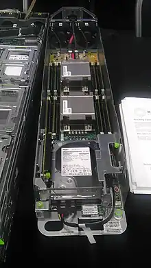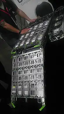 Open Vault storage building blocks offer high disk densities, with 30 drives in a 2U Open Rack chassis designed for easy disk drive replacement. The 3.5 inch disks are stored in two drawers, five across and three deep in each drawer, with connections via serial attached SCSI.[17] This storage is also called Knox, and there is also a cold storage variant where idle disks power down to reduce energy consumption.[18] Another design concept was contributed by Hyve Solutions, a division of Synnex in 2012.[19][20] At the OCP Summit 2016 Facebook together with Taiwanese ODM Wistron's spin-off Wiwynn introduced Lightning, a flexible NVMe JBOF (just a bunch of flash), based on the existing Open Vault (Knox) design.[21][22]