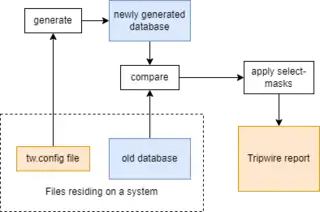 Open Source Tripwire later asks for the local passphrase when creating an initial database with file signatures. It runs the first scan of the system and saves the result to the database. Afterwards, it runs integrity checks and compares the result with the database. For example, if a new file is created then it will be listed in the subsequent integrity check report.[3] Open Source Tripwire can be configured to regularly run integrity checks and send report e-mails to the system administrator.[11] The database should be initialized before the system is at risk of being compromised.