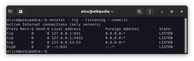 alice@wikipedia:~$ netstat --tcp --listening --numeric