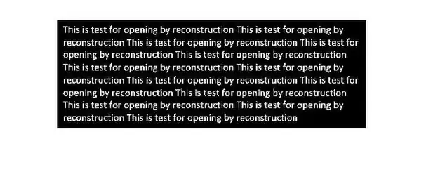 The images below present a simple opening-by-reconstruction example which extracts the vertical strokes from an input text image. Since the original image is converted from grayscale to binary image, it has a few distortions in some characters so that same characters might have different vertical lengths. In this case, the structuring element is an 8-pixel vertical line which is applied in the erosion operation in order to find objects of interest. Moreover, morphological reconstruction by dilation, [1] iterates times until the resulting image converges.