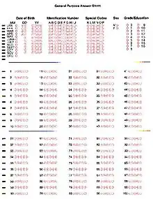 Modern optical answer sheets are read based on reflected light, measuring lightness and darkness. They do not need to be filled in with a number two pencil, though these are recommended over other types (this is due to the lighter marks made by higher-number pencils and the smudges from number 1 pencils). Black ink will be read, though many systems will ignore marks that are the same color the form is printed in.[12] This also allows optical answer sheets to be double-sided because marks made on the opposite side will not interfere with reflectance readings as much as with opacity readings.