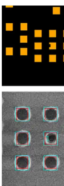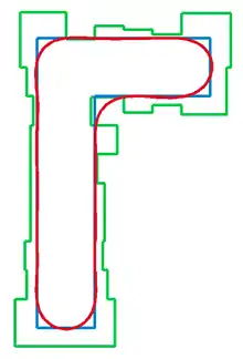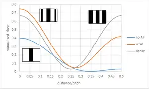 Subresolution assist features (SRAFs) are features which are separated from targeted features but assist in their printing, while not being printed themselves. Printing SRAFs are a critical yield detractor and require additional OPC models to determine and remove SRAFs where undesirable printing may occur.[8] SRAFs have more pronounced effects on the diffraction spectrum than targeted feature resizing and/or attachments. The requirement to not print constrains their use with low doses only. This could pose issues with stochastic effects.[9] Hence their main application is to improve depth of focus for isolated features (dense features do not leave enough room for SRAF placement). Since SRAFs redistribute energy toward higher spatial frequencies or diffraction orders, the depth of focus is more dependent on the illumination angle (center of spectrum of spatial frequencies or diffraction orders) as well as the pitch (separation of spatial frequences or diffraction orders). In particular, different SRAFs (position, shape, size) could result in different illumination specifications.[10][11] In fact, certain pitches forbid the use of SRAFs for specific illumination angles.[12] Since the pitch is usually predetermined, some illumination angles must be avoided even with the use of SRAF OPC. Generally, though, SRAFs cannot be a complete solution, and can only approach the dense case, not match it.[13]