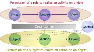 In computer security, organization-based access control (OrBAC) is an access control model first presented in 2003. The current approaches of the access control rest on the three entities (subject, action, object) to control the access the policy specifies that some subject has the permission to realize some action on some object.