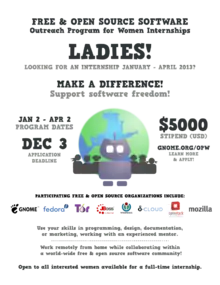 The January 2013 round of the program, renamed to the Free and Open Source Software Outreach Program for Women, expanded to provide 25 internships with 10 organizations (Deltacloud, Fedora, GNOME, JBoss, Mozilla, Open Technology Institute, OpenITP, OpenStack, Subversion, and Wikimedia), with GNOME Foundation Executive Director Karen Sandler joining Zhurakhinskaya in organizing the program.[11]
