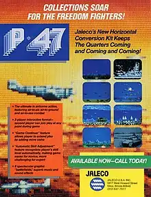P-47: The Phantom Fighter[lower-alpha 1] is a 1988 horizontally scrolling shooter arcade video game originally developed by NMK and published by Jaleco. Set during World War II, players control a Republic P-47 Thunderbolt fighter aircraft to face against the Nazis, who are occupying multiple countries around the world. Its gameplay involves destroying waves of enemies, picking up power-ups and new weapons, and destroying bosses. It ran on the Mega System 1 hardware.