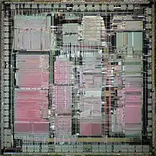 This design includes a famous "silicon doodle" of a velociraptor dinosaur (visible here in upper right corner of the die shot image).[2]