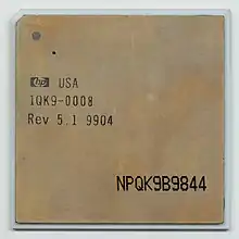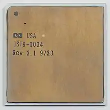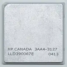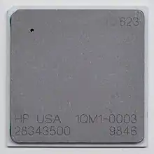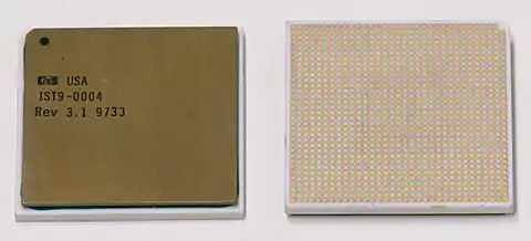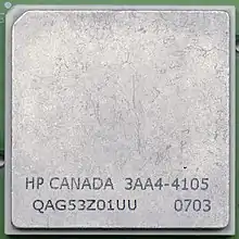The PA-8000 has 3.8 million transistors and measures 17.68 mm by 19.10 mm,[5] for an area of 337.69 mm2. It was fabricated by HP in their CMOS-14C process, a 10% gate shrink of the CMOS-14 process.[4] The CMOS-14C process was a 0.5 μm, five-level aluminum interconnect, complementary metal–oxide–semiconductor (CMOS) process. The die has 704 solder bumps for signals and 1,200 for power or ground. It is packaged in a 1,085-pad flip chip alumina ceramic land grid array (LGA).[6] The PA-8000 uses a 3.3 V power supply.