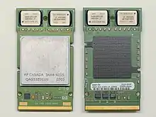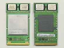 It consisted of 300 million transistors, of which 25 million were for logic, on a 23.6 mm by 15.5 mm (365.8 mm2) die.[13] It was fabricated by IBM in 0.13 μm SOI process with copper interconnects and low-κ dielectric. The PA-8800 is packaged in a ceramic ball grid array mounted on a printed circuit board (PCB) with the four ESRAMs, forming a module similar to those used by early Itanium microprocessors.