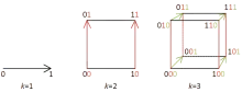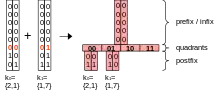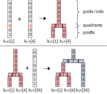 This works trivially for lookup, insert and remove operations. Window queries need to be converted from -dimensional vectors to -dimensional vectors. For example, for a window query that matches all boxes that are completely inside the query box, the query keys are:[7][8]