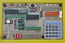 The PMI-80 was a single-board microcomputer produced by Tesla Piešťany, Czechoslovakia, since 1982. It was based on the MHB 8080A CPU (a Tesla clone of the Intel 8080), clocked at 1.111 MHz. Instead of a raster graphic display output and classical keyboard, it had a calculator-style nine-digit seven-segment red LED display and a 25-key calculator-type keypad with hexadecimal and function keys (including hardware REset and Interrupt). The PMI-80 had 1 KiB of ROM (expandable to 2 KiB) and fixed 1 KiB of RWM. Eight (expandable to 32) I/O lines were provided for user along with complete system bus. Connected could be e.g., a card with a DAC of 0–12 V range.