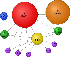 Suppose instead that page B had a link to pages C and A, page C had a link to page A, and page D had links to all three pages. Thus, upon the first iteration, page B would transfer half of its existing value (0.125) to page A and the other half (0.125) to page C. Page C would transfer all of its existing value (0.25) to the only page it links to, A. Since D had three outbound links, it would transfer one third of its existing value, or approximately 0.083, to A. At the completion of this iteration, page A will have a PageRank of approximately 0.458.