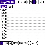 Date Book shows a daily or weekly schedule, or a simple monthly view. The daily schedule has one line per hour, between user-selected begin and end times. Clicking on an empty line creates a new event. Empty lines are crowded out by actual events, whose start and stop times are shown by default bracketed in the left margin. The newer Calendar app adds the following features: New Day view, use of categories for events, event location, event can span midnight, event details, birthdays as timeless events. It supports time zone designation for events, a feature lacking in some more recent competitors.