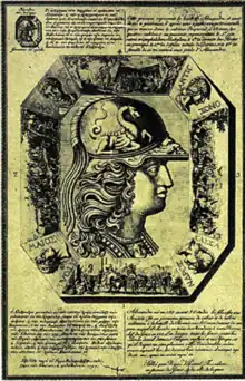 The Pamphlet of Rigas Feraios is a large chalcography (45 × 29 cm) printed in Vienna in 1797 by Rigas Feraios. It depicts a portrait of Alexander the Great framed by war scenes and portraits of his generals. The etching was incised by François Müller,[1] who cooperated with Rigas for his cartographic work which he published the same year: Rigas' Map of Greece (1797), the New Map of Wallachia and part of Transylvania (1797) and the General Map of Moldavia (1797). It was released in 1200 copies from the printing press of Nitsch. One of the two copies that have been discovered in Greece is displayed in the National Historical Museum of Greece.[2]