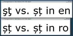 Setting the locale via the POSIX environment variable, e.g. LANG=ro_RO.UTF-8 will also cause Pango to use 'locl' font feature. Finally, you can change the language on the fly in the same text using Pango markup, e.g.: