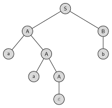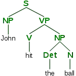 A parse tree is made up of nodes and branches.[4] In the picture the parse tree is the entire structure, starting from S and ending in each of the leaf nodes (John, ball, the, hit). In a parse tree, each node is either a root node, a branch node, or a leaf node. In the above example, S is a root node, NP and VP are branch nodes, while John, ball, the, and hit are all leaf nodes.
