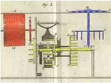 Bruno von Freytag Loringhoff, a mathematics professor at the University of Tübingen built the first replica of Schickard's machine but not without adding wheels and springs to finish the design.[39] This detail is not described in Schickard's two surviving letters and drawings. A problem in the operation of the Schickard machine, based on the surviving notes, was found after the replicas were built.[40] Schickard's machine used clock wheels which were made stronger and were therefore heavier, to prevent them from being damaged by the force of an operator input. Each digit used a display wheel, an input wheel and an intermediate wheel. During a carry transfer all these wheels meshed with the wheels of the digit receiving the carry. The cumulative friction and inertia of all these wheels could "...potentially damage the machine if a carry needed to be propagated through the digits, for example like adding 1 to a number like 9,999".[41] The great innovation in Pascal's calculator was that it was designed so that each input wheel is totally independent from all the others and carries are propagated in sequence. Pascal chose, for his machine, a method of re-zeroing that propagates a carry right through the machine.[17] It is the most demanding operation to execute for a mechanical calculator and proved, before each operation, that the carry mechanism of the Pascaline was fully functional. This could be taken as a testament to the quality of the Pascaline because none of the 18th century criticisms of the machine mentioned a problem with the carry mechanism and yet this feature was fully tested on all the machines, by their resets, all the time.[18]