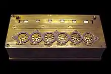 Pascal's calculator (also known as the arithmetic machine or Pascaline) is a mechanical calculator invented by Blaise Pascal in 1642. Pascal was led to develop a calculator by the laborious arithmetical calculations required by his father's work as the supervisor of taxes in Rouen.[2] He designed the machine to add and subtract two numbers directly and to perform multiplication and division through repeated addition or subtraction.