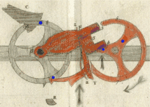 On all the wheels of all the known machines, except for the machine tardive,[9] two adjacent spokes are marked; these marks differ from machine to machine. On the wheel pictured on the right, they are drilled dots, on the surveying machine they are carved; some are just scratches or marks made with a bit of varnish,[10] some were even marked with little pieces of paper.[11]