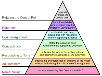 Graham proposed a disagreement hierarchy in a 2008 essay How to Disagree,[25] putting types of argument into a seven-point hierarchy and observing that "If moving up the disagreement hierarchy makes people less mean, that will make most of them happier." Graham also suggested that the hierarchy can be thought of as a pyramid, as the highest forms of disagreement are rarer.