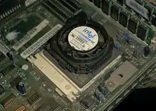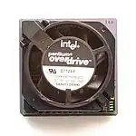 The Pentium OverDrive is a heavily modified, 3.3 volt Pentium P54 core manufactured on 0.6 micrometer technology. It is fitted with a 486-compatible bus unit (though with an increased pin-count), an integrated heatsink and fan, and 32 kB of level 1 cache, double the 16 kB offered on regular P54C chips.[1] As the data bus was effectively reduced to 32-bit width, per-clock performance was much lower than that of a 'regular' Pentium, though still substantially faster compared to a similarly clocked 486 owing to the Pentium's architectural improvements, such as the much improved FPU. It was also equipped with an integrated 3.3 volt power regulator as many 486 motherboards only provided 5 volt power.