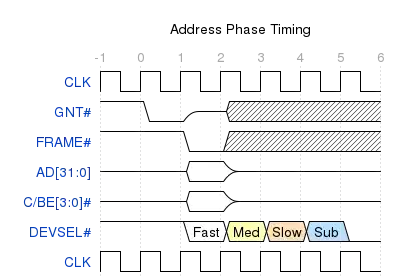 Additional timing constraints may come from the need to turn around are the target control lines, particularly DEVSEL#. The target deasserts DEVSEL#, driving it high, in the cycle following the final data phase, which in the case of back-to-back transactions is the first cycle of the address phase. The second cycle of the address phase is then reserved for DEVSEL# turnaround, so if the target is different from the prior one, it must not assert DEVSEL# until the third cycle (medium DEVSEL speed).