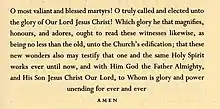 Along with these characteristics, Perpetua bears the distinct personality of Gill's characteristic preferences in carving monumental lettering for uses such as tombstones, dedications and war memorials. Fine book printer Christopher Sandford of the Chiswick Press, who knew Gill, commented that "all Gill's types…are variants of Gill's own very lovely, very personal hand-lettering."[11] Letter designs in Perpetua common in Gill's work include the 'a' that forms a sharp point without serif, the extended leg of the 'R' and the flat-topped 'A'.[12] In italic, the 'a' has a smooth top and the 'g' is a "single-storey" design recalling handwriting.[13][14] The top of the 'f' has a wedge-shaped serif.[15] Historian James Mosley suggests that a rubbing of a 1655 engraving at Rye may have been an influence on the design.[16] Perpetua's italic also has some flourishes in the capitals. However, rather than being fully cursive in style, some characters resemble oblique type or the "sloped roman" style, a style rarely used for serif fonts in which letters are slanted but do not take on as many handwriting characteristics as in a "true italic". Examples of this are the flat foot serifs on letters like 'h', 'm' and 'n', where most body text italics would have a curl or no serif at all.[17] In structure, Perpetua appears relatively light in colour and rather "small" on the page, although this is less problematic in the carefully designed metal type, in which every size was carefully drawn differently, than in digital facsimile.[18][19]