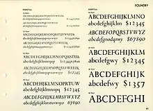 Financier, by Kris Sowersby, is a respected revival influenced by Perpetua and other Gill designs, in particular the more solid Solus and Joanna.[71][72] Particularly acclaimed for being released in optical sizes for small and large text unlike the official Monotype digitisations, it was commissioned by the Financial Times and has also been commercially released.[73][74]