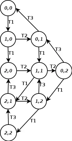 For example, if in the net N, both places are assigned capacity 2, we obtain a Petri net with place capacities, say N2; its reachability graph is displayed on the right.