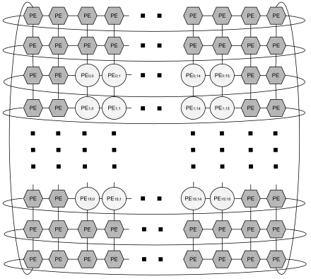 The STP has a 2-D array of PEs: for example, a 16x16 array of full PEs and four lanes of simplified PEs called "halo". The STP has a scalar processor, called scalar lane (SCL), that adds control instructions with a small instruction memory. The last component of an STP is a load store unit called sheet generator (SHG), where the sheet is the PVC memory access unit.[2]