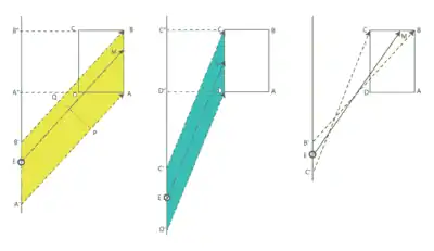 The working of the linear planimeter may be explained by measuring the area of a rectangle ABCD (see image). Moving with the pointer from A to B the arm EM moves through the yellow parallelogram, with area equal to PQ×EM. This area is also equal to the area of the parallelogram A"ABB". The measuring wheel measures the distance PQ (perpendicular to EM). Moving from C to D the arm EM moves through the green parallelogram, with area equal to the area of the rectangle D"DCC". The measuring wheel now moves in the opposite direction, subtracting this reading from the former. The movements along BC and DA are the same but opposite, so they cancel each other with no net effect on the reading of the wheel. The net result is the measuring of the difference of the yellow and green areas, which is the area of ABCD.