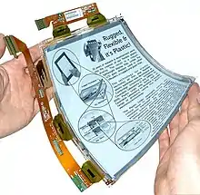 Plastic Logic Germany develops and manufactures flexible plastic displays for third party end-devices.[29] Because the displays are made of plastic, they are resistant to breaking and are designed for use in robust mobile devices.[30] In March 2013, the readers of the German electronic products magazine Elektronik voted Plastic Logic's flexible colour display "Optoelectronic Product of the Year 2013".[31][32]