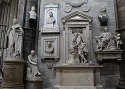George Frideric Handel | 1685 | 1759 | 74 | Life-size sculpture by Louis-François Roubiliac with musical scores and instruments represented.[43][44] | Composer |