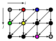 The dependencies of src, after loop skewing. The array elements will be processed in the order gray, red, green, blue, yellow...