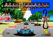 The tracks have a roller coaster feel to them, with many steep climbs and falls, as well as the ability to "fall" off higher levels. To add to this feeling, the sit-down cabinet was built atop a raised hydraulic platform, and the machine would tilt and shake quite violently. Each circuit, labeled from "A" to "E" has a certain theme to it (for example, circuit A has cities, circuit B has deserts, circuit C has beaches, etc.) in a series of five tracks. There are also four laps for each course. Course A was Springfield Ovalshape, Foofy Hilltop, Snowhill Drive, Octopus Oval and Curry De Parl, Course B was Swingshot City, Phantom Riverbend, Octangular Ovalshape, Charlotte Beach and Highland Spheres, Course C was Bum Beach, Jason Bendyline, Nighthawk City, Zanussi Island and Wasteman Freefall, Course D was Mexico Colours, Oxygen Desert, Jamie Road, Monaco Da Farce and Blow Hairpin, Course E was Aisthorpe Springrose Valley, Patterson Nightcity, Lydia Rightaway, Bungalow Ridgeway and Karen Longway, The two extra stages with Courses A, C and E resemble a jet fighter from After Burner II and Courses B and D resemble a superbike from Super Hang-On.