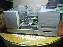 The blue and white G3's enclosure design was widely praised at the time for being easy to open up and work on.[34] The entire right side of the case is a door that hinges down by pulling a recessed latch at the top. No components need to be removed or unplugged, and the computer can remain running while opened. The logic board is positioned in the door, providing access to all components. Hard drives are mounted in a bracket affixed with one screw on the floor of the case. There is room for four internal hard drives and an internal fan is positioned at the side of the case to blow cooling air over them. Removable drives are in a more conventional position at the top of the case.